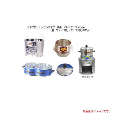 かまどセット[ステンかまど・羽釜・アルミセイロ 28cm (蓋・竹スノコ付)[セイロ2段]のセット/セイロ2段で4升 《北海道、沖縄、離島は別途送料がかかります。代引き不可》