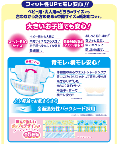 【特徴】 GOO.NスーパーBIGは、ベビー用・大人用のどちらのサイズも合わなかった方のための 中間サイズ下着感覚の紙おむつです。